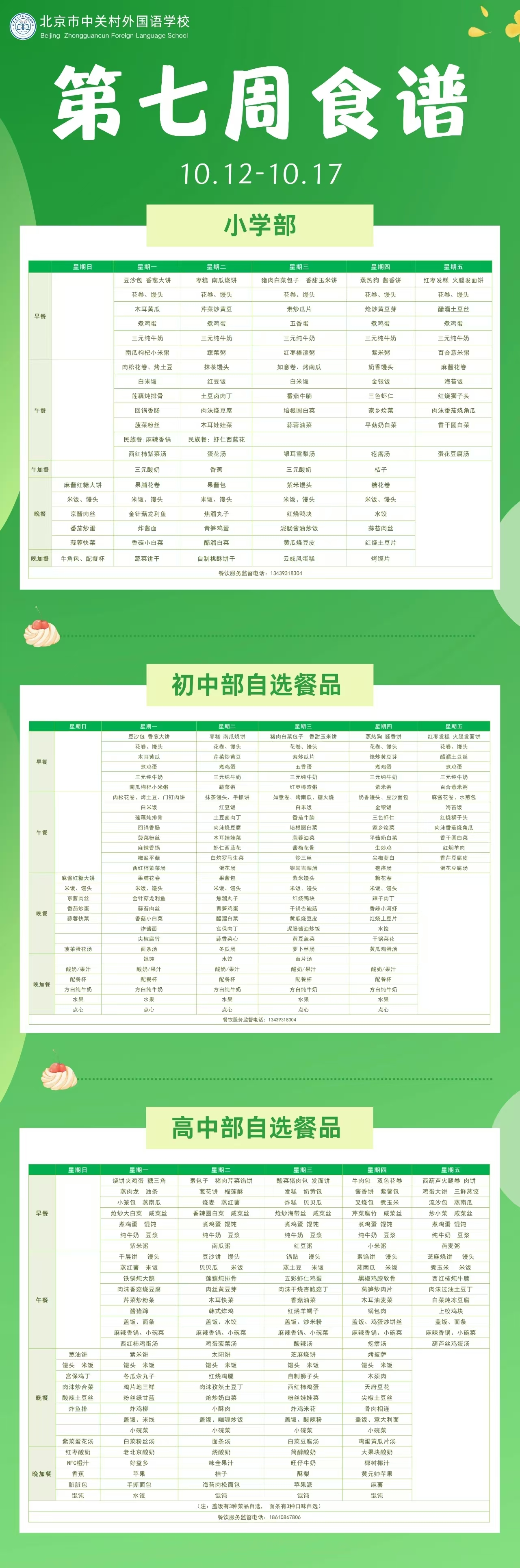中关村外国语学校第十一周学生食谱