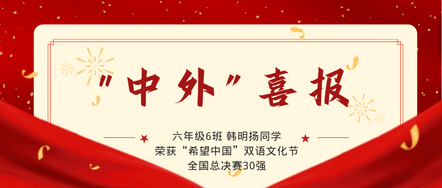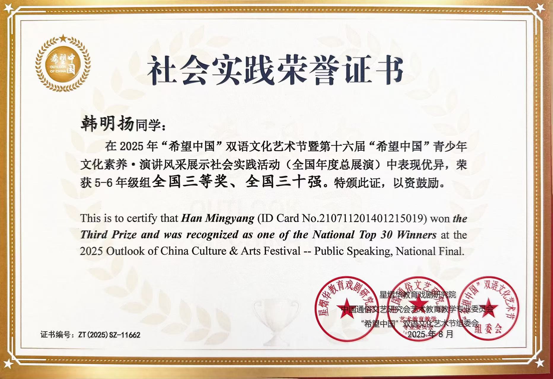 Exciting News! We are delighted to announce that Han Mingyang from Class 6, Grade 6 of our school has achieved outstanding results in the 2025 "Outlook of China" Bilingual Culture & Art Festival and the 16th "Outlook of China" Youth Cultural Literacy · Speech Presentation, earning a place among the Top 30 National Finalists!