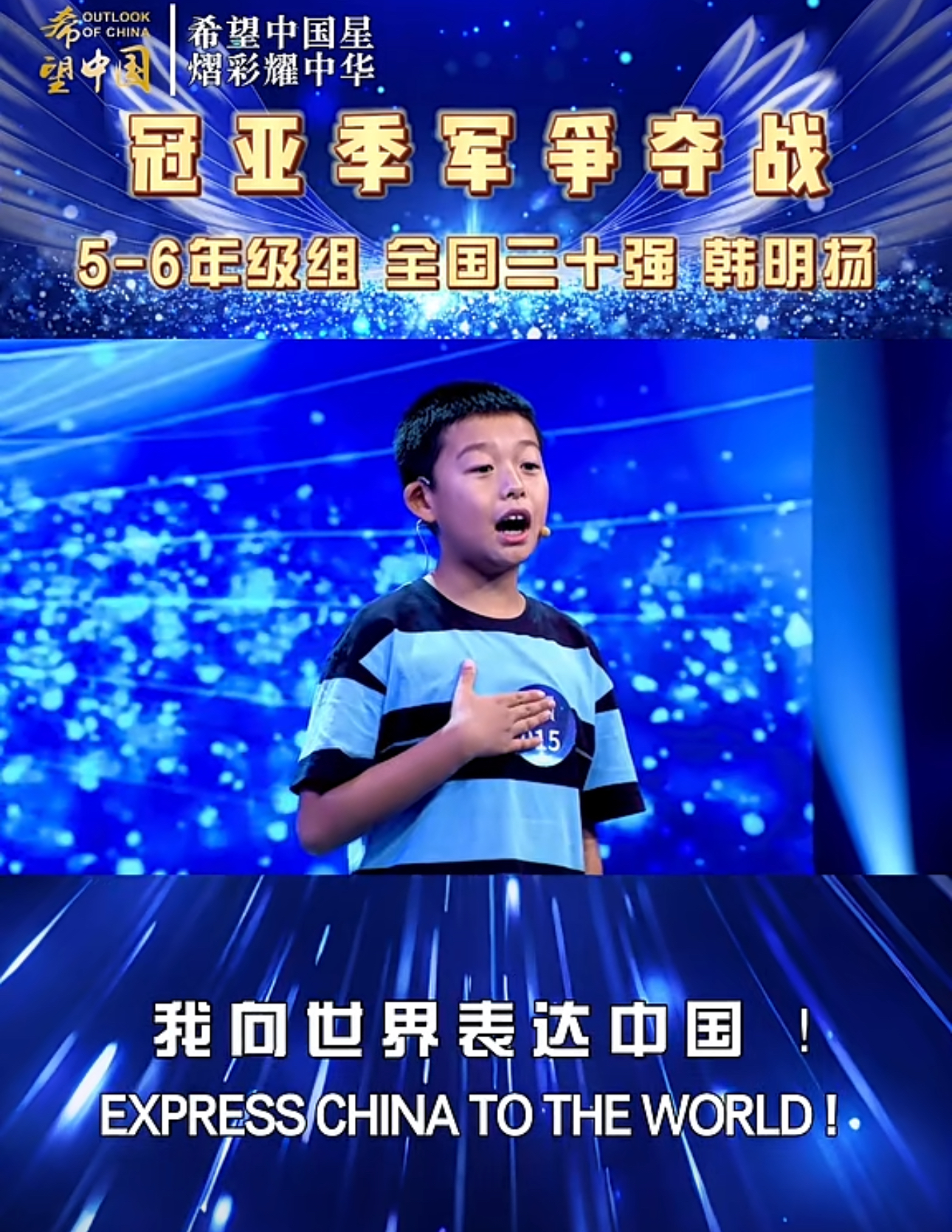 喜讯传来!我校六年级6班韩明杨同学在2025年“希望中国”双语文化艺术节暨第十六届“希望中国”青少年文化素养·演讲风采展示活动中表现突出,荣获全国三十强!