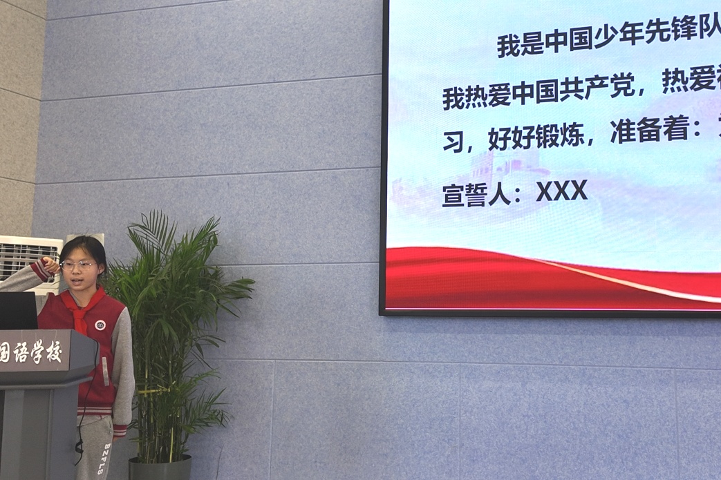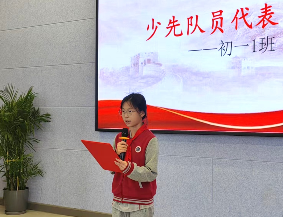 初一(1)中队舒滢熹同学作为少先队员代表发言,倡议全体队员勤奋学习、全面提升素养,以实际行动践行“强国复兴有我”的誓言,以昂扬向上的精神面貌迎接挑战,团结一心为中华民族伟大复兴贡献青春力量。