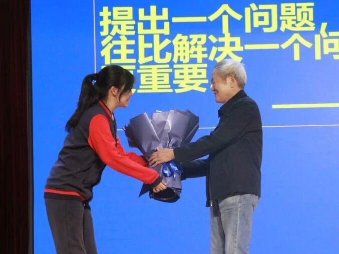 在热烈的掌声中,学生会主席、高二一班张子萱同学手捧鲜花走向郭传杰院士。这束鲜花,不仅承载着全校师生对院士的深深敬意,更寄托着年轻一代对科学精神的真诚向往。