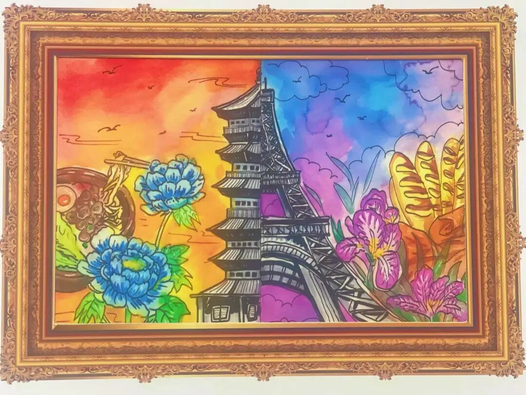 邸左桐的作品《灵思中西,画韵生辉》融合东西方艺术元素,从全球近万件参赛作品中脱颖而出。Di Zuo Tong’s work, "Blending Eastern and Western Inspiration, Radiating the Charm of Painting", stood out for its creative integration of Eastern and Western artistic elements.