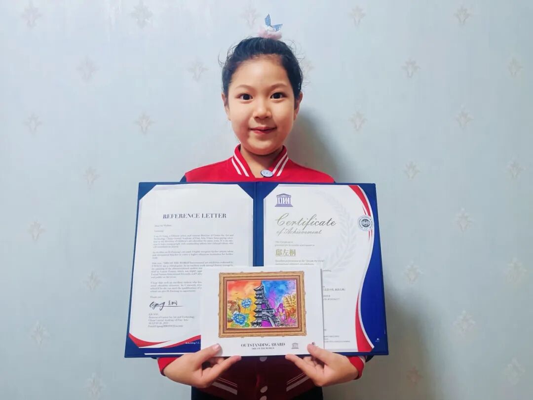北京市中关村外国语学校小学部二年级2班邸左桐同学荣获联合国教科文组织支持的“DREAM THE WORLD”国际儿童艺术展大奖,作品将于法国巴黎卢浮宫卡鲁塞尔厅展出。We are proud to announce that Di Zuo Tong, a student from Class 2, Grade 2 of our school, has been awarded at the UNESCO-supported "DREAM THE WORLD" International Children's Art Exhibition. Her artwork was displayed at the Carrousel du Louvre in Paris, France.