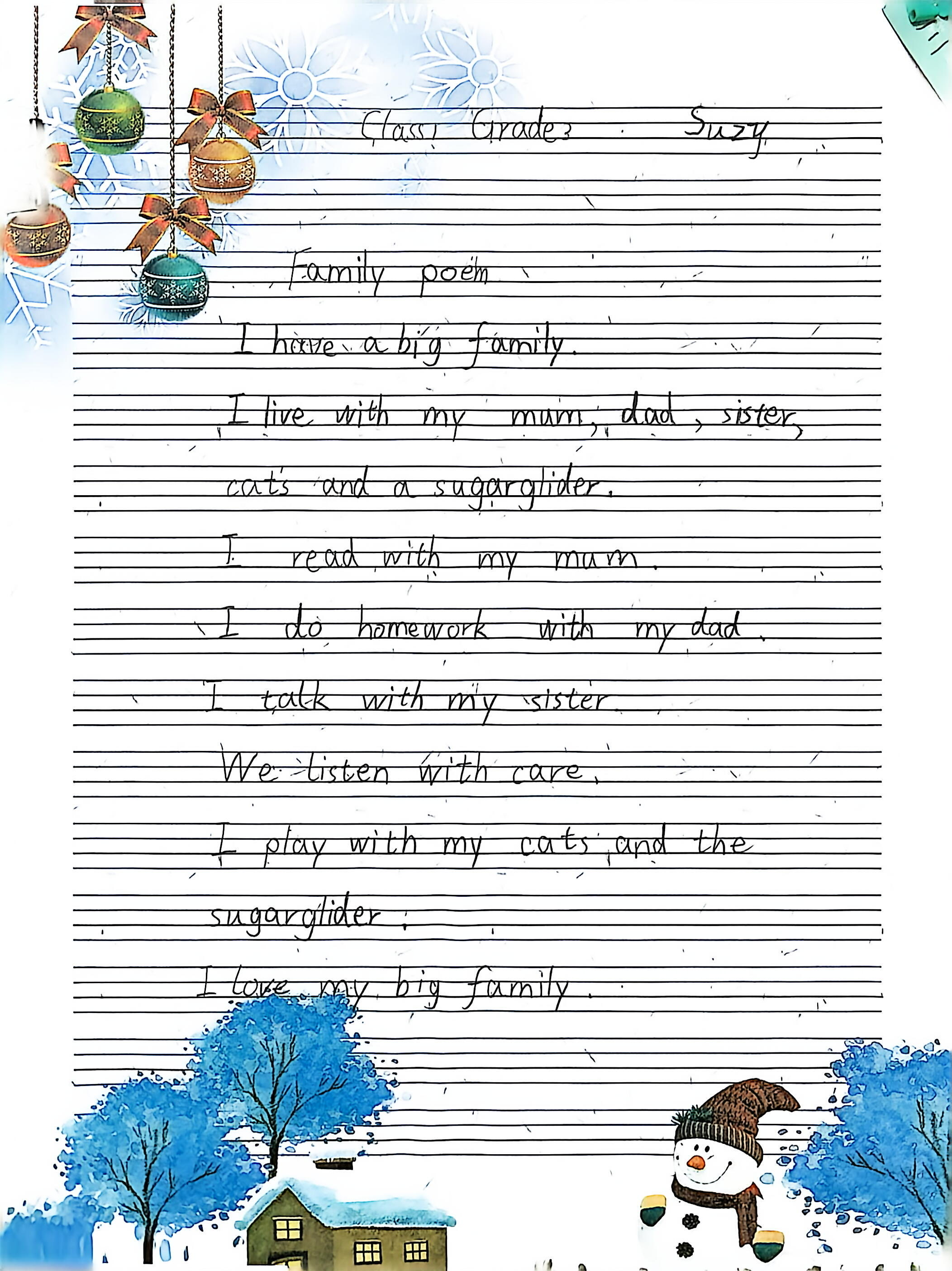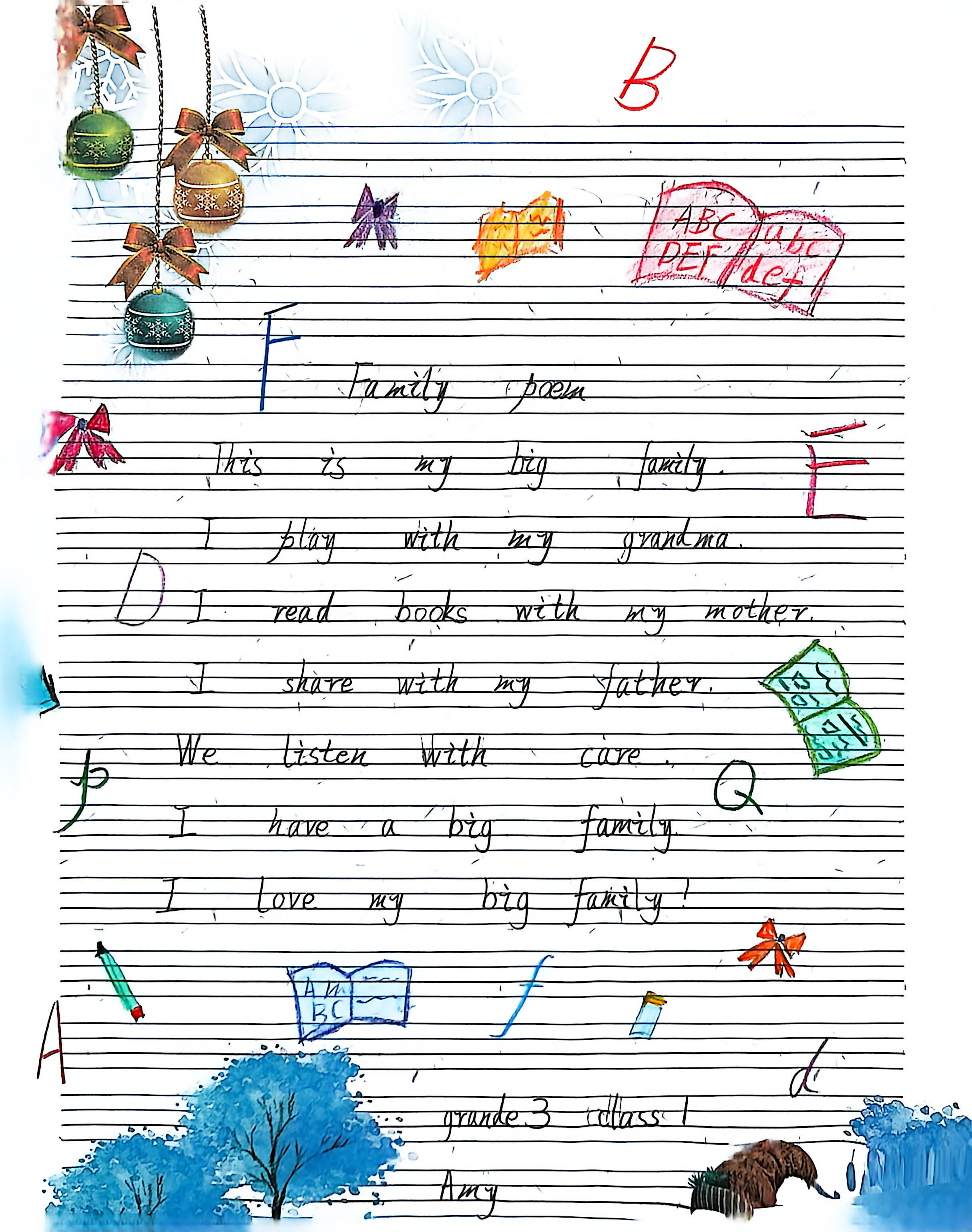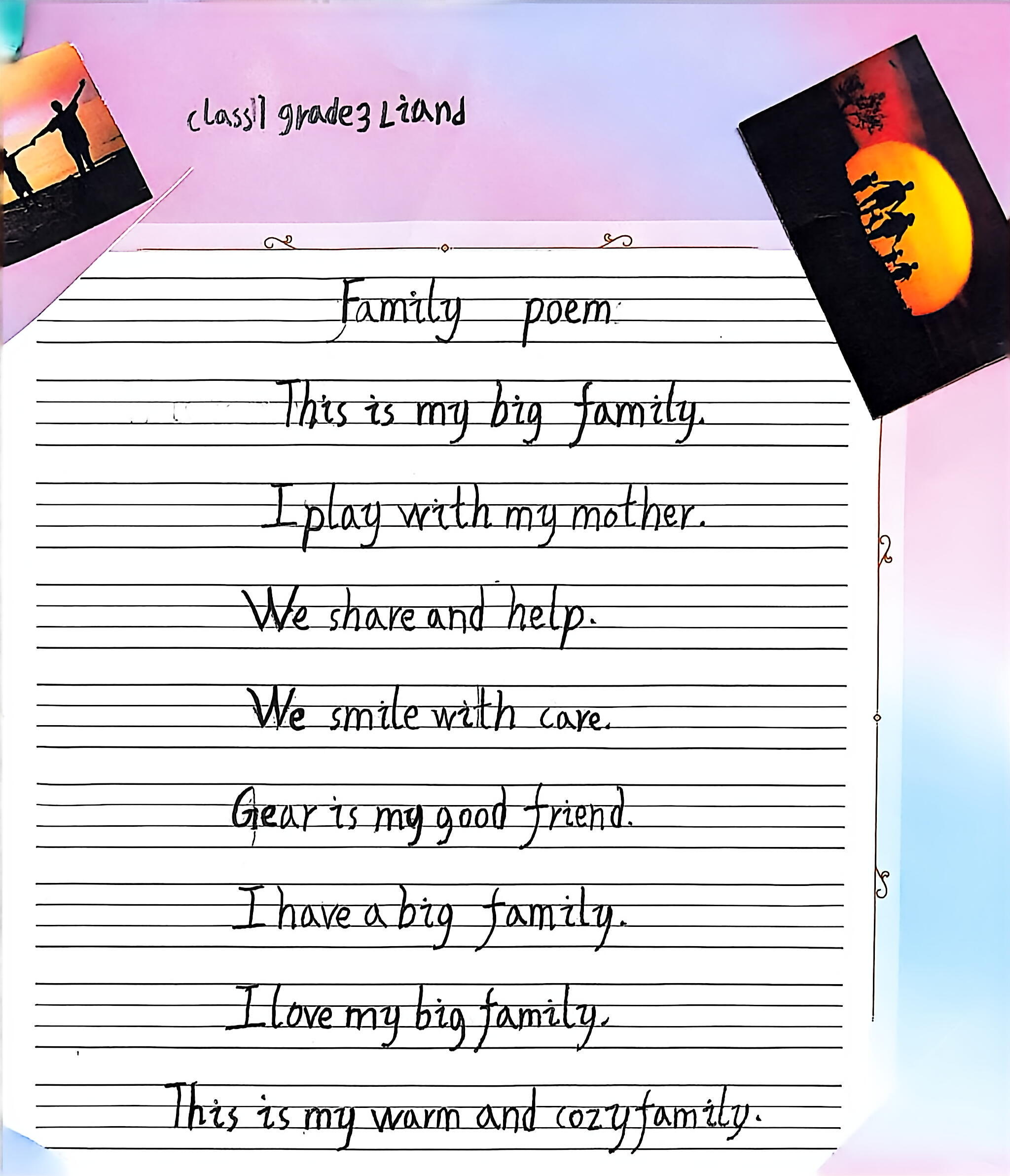 In the early winter, poetry is blooming quietly in our Grade 3 classrooms. In this "Family Poem" project, our children used their sincere, youthful words to weave their feelings of love into verse. The "Family Poem" project aimed to break the limits of traditional vocabulary and grammar classes, letting students personally feel the vitality, warmth, and power of language.