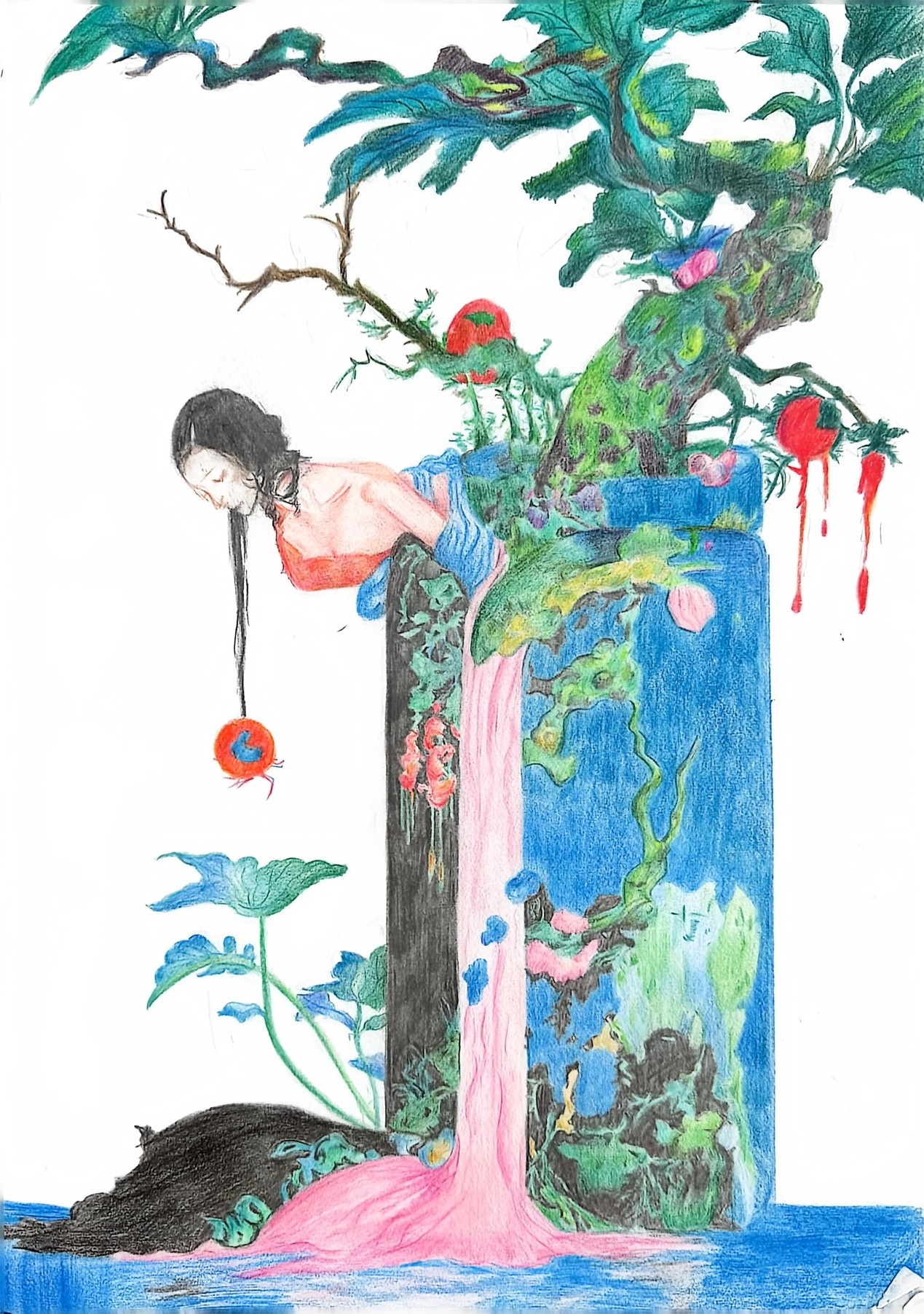 描述:我通过描绘一位女性与自然元素的融合,表达了人类与环境的紧密联系。画中的女性与树木、花朵、水生植物交织在一起,象征着我们与自然的不可分割。然而,画面中的色彩和形态也暗示了环境的脆弱性,提醒我们全球变暖对生态系统的威胁。通过这张彩铅作品,我呼吁大家关注气候变化,采取行动保护我们的地球。