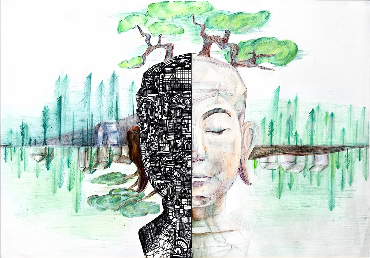 描述:这幅作品通过对比自然与机械的元素,探讨了全球变暖对人类与自然关系的深远影响。画面中,人类的一半面孔由自然景观构成,另一半则由机械线条组成,象征着人类对自然的破坏与依赖。通过这种视觉冲击,我呼吁人们反思我们的行为,保护我们的地球,实现人与自然的和谐共存。