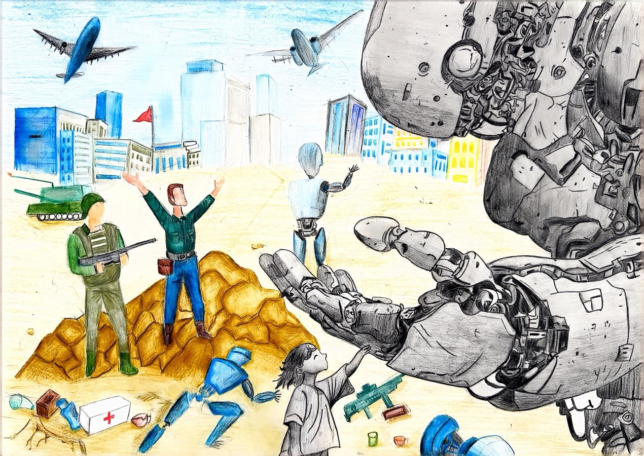 描述:我通过这幅作品以科幻的手法描绘了全球变暖可能带来的极端后果。画面中,人类与机器人在荒废的城市中对峙,象征着环境恶化导致的资源争夺。通过这种紧张的对抗场景,我试图唤起人们对气候变化紧迫性的认识,强调保护环境、避免未来灾难的重要性。