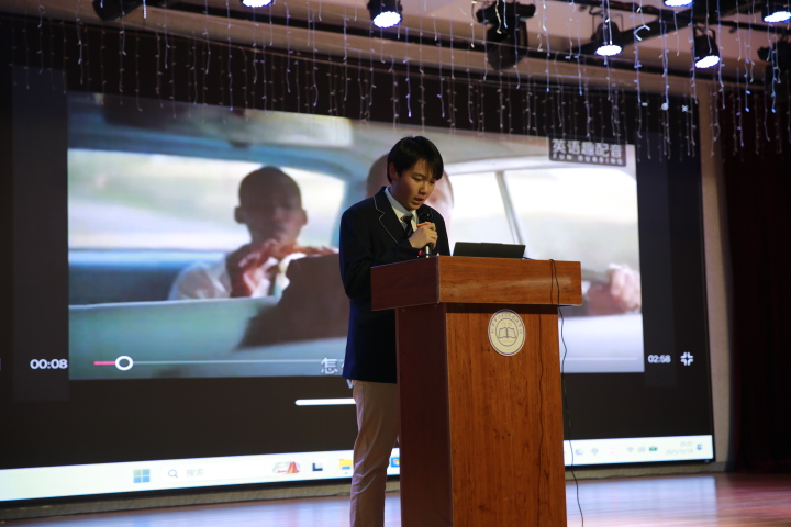 中文组率先登场,14位选手各展所长:七年级3班庄思齐以《白蛇传》中婉转清越的嗓音,将观众带回烟雨西湖;八年级3班谷锦航演绎《流浪地球》,铿锵有力,引得全场屏息凝神,掌声雷动;十一年级7班吴瑀熙以沉稳嗓音再现《我的1919》顾维钧的慷慨陈词,将民族尊严的铿锵力量注入字字句句,全场屏息后掌声雷动。九年级3班刘春和怀抱吉他登台,一曲《成都》温柔流淌,为中英文组的转换铺就诗意过渡。