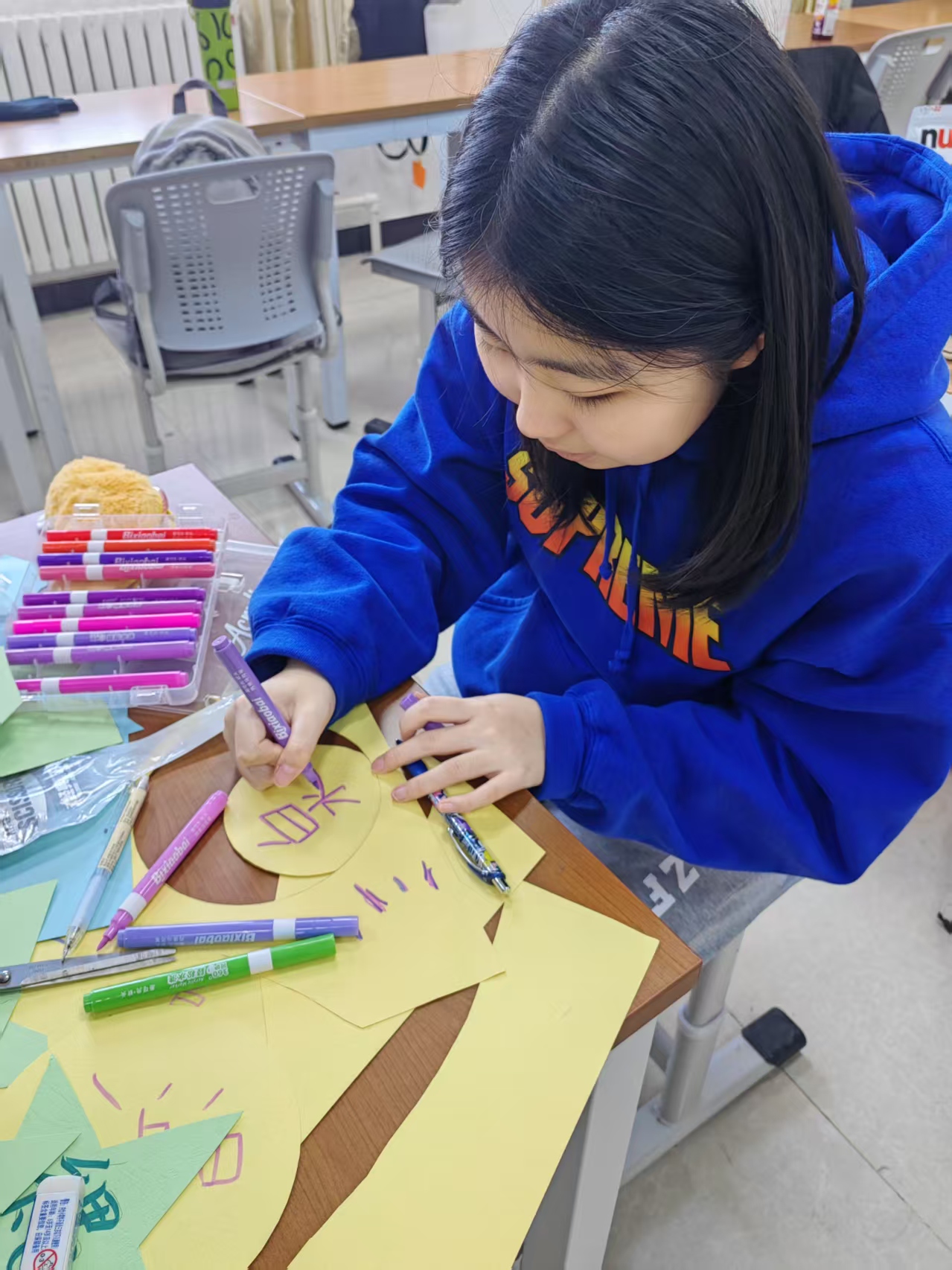 “笔绘大洋路·心向花园州”惊艳全场——走廊巨幅学生手绘《十二门徒岩》气势恢宏,教室内“夏日圣诞角”与未来规划站相映成趣。一位母亲驻足良久:“他把地理变成了艺术。”