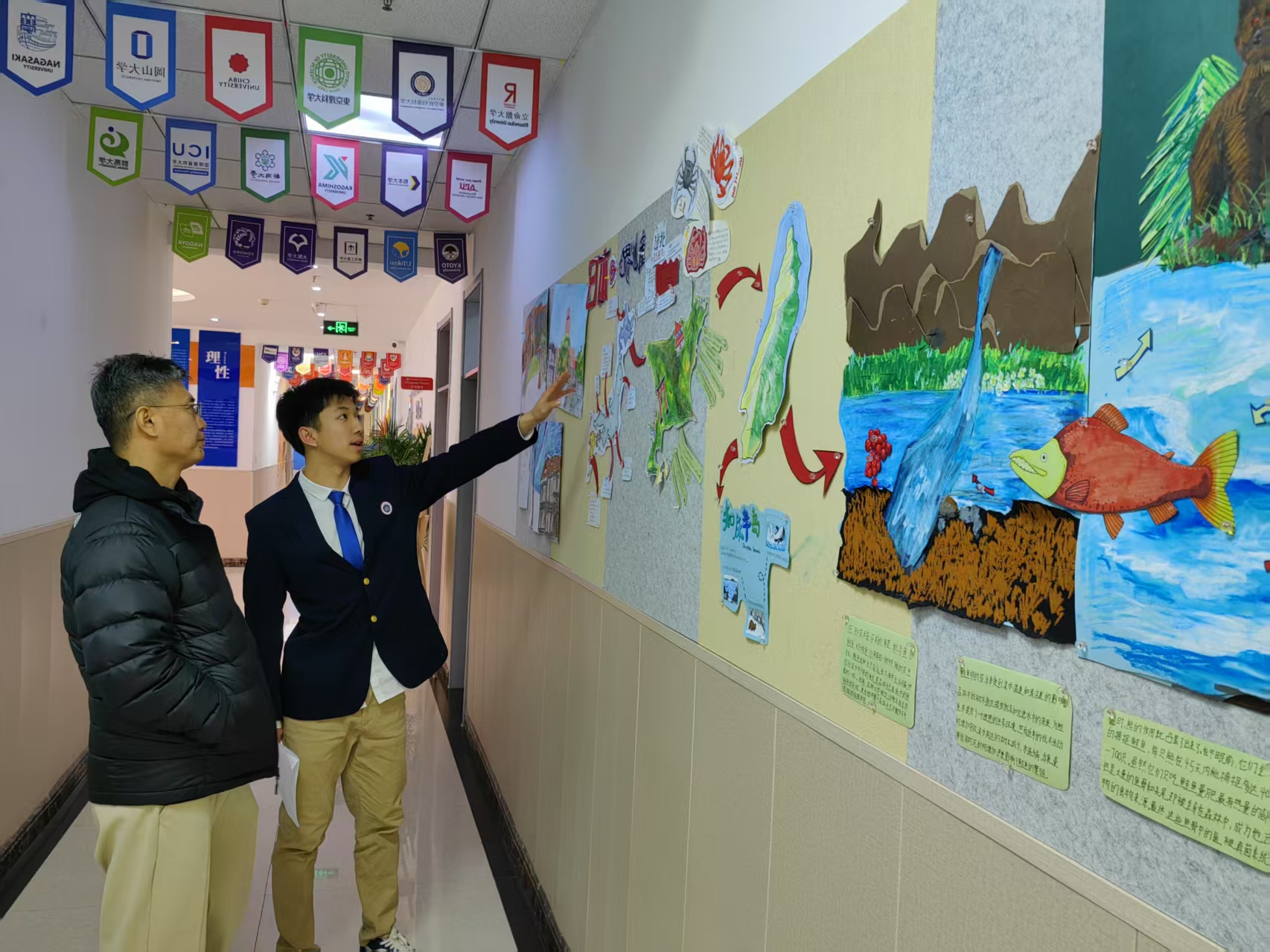 聚焦九州火山、温泉与琉球文化,学生自制海报讲述海洋文明故事。一位父亲惊讶:“连鹿儿岛农业如何受火山影响都能讲清!”