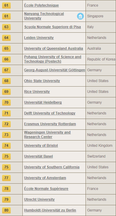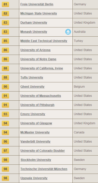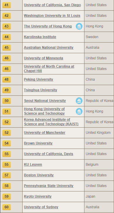 澳洲排名第二的大学是澳洲国立大学,位列第45名。悉尼大学是新州排名最高的大学,从上一年的第72名晋升至第60名。另外五所入选大学分别为:昆士兰大学、蒙纳什大学、UNSW、西澳大学、阿德莱德大学。