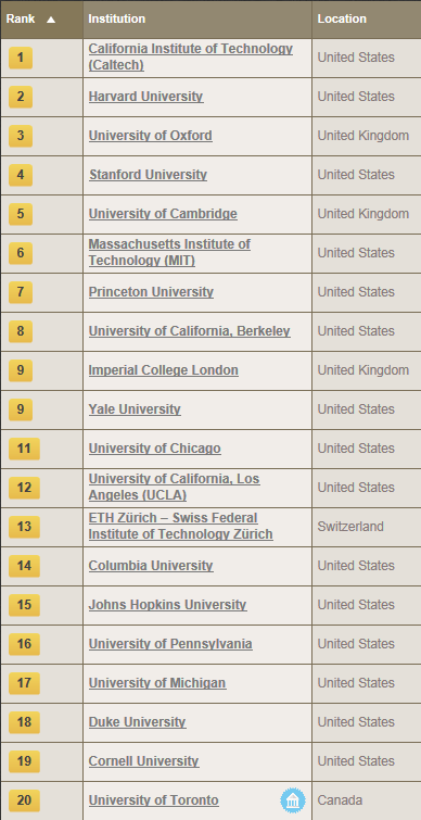 美国加州理工大学连续四年夺得榜首,而美国哈佛大学和英国牛津大学先前同名,但牛津大学这次滑落至第3名。美国依旧是最多名校的国家,世界前20名大学中,就有15所在美国。
